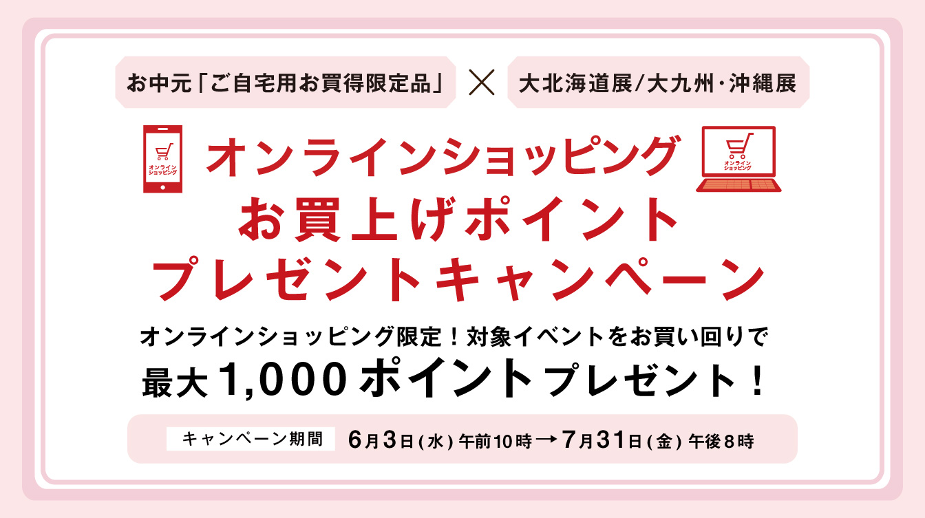 ※お中元「ご自宅用お買得限定品」のご購入が必須となります。「大北海道展」「大九州・沖縄展」のみご購入の場合は、ポイントプレゼントの対象となりません。