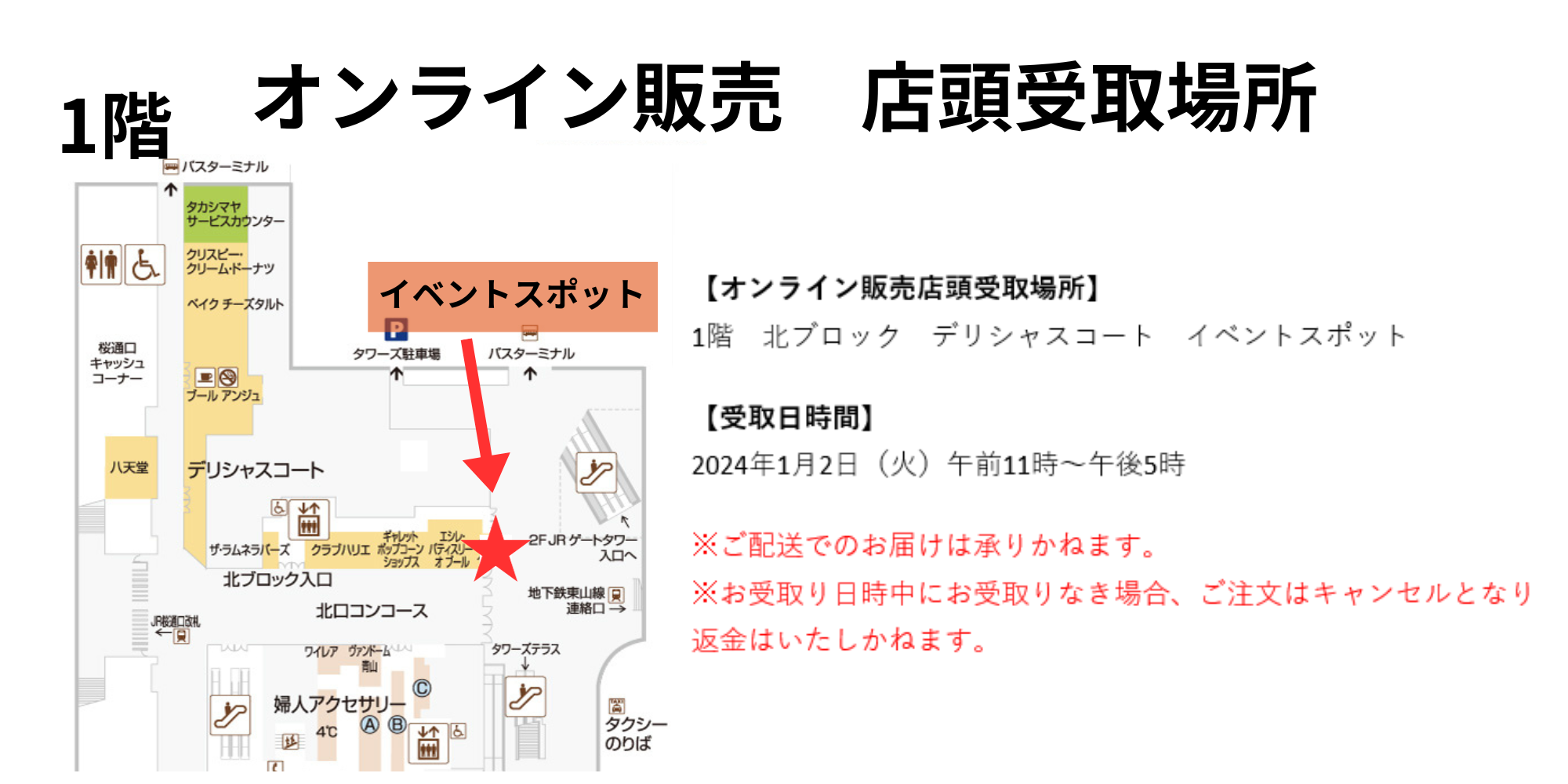 「店頭お受取り専用:食料品 福袋」オンライン販売 下図内の目印箇所にてお渡しとなります。